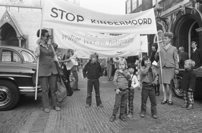 A principios de la década de los setenta, la sociedad amsterdamesa atravesaba una crisis de inseguridad vial. En aquel entonces, las muertes viales en los Países Bajos se contaban por miles, con Ámsterdam encabezando esa lista. Sólo en 1971 más de 400 menores murieron en siniestros viales. Así nació Stop de Kindermoord – “Detengamos los asesinatos de niños”–, una campaña popular cuya finalidad era sencilla pero ambiciosa: regresar a la niñez el derecho de calles seguras y divertidas, donde jugar, salir a andar en bici o pasear con sus amigos no fuera un riesgo.