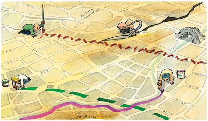 Todos somos cartógrafos informales de nuestra ciudad. Y en una ciudad menos que perfecta, como la ciudad de México, hay mucho que consagrar a la memoria. Quienes se mueven en automóvil o en bicicleta conocen entre unas docenas y algunos cientos de accidentes geográficos: un bache insidioso que se oculta tras un tope improvisado, la orografía de una calle arrugada por las fuerzas tectónicas del asfalto. Los peatones saben, por su lado, dónde hay registros abiertos (le han costado la vida al menos a uno), cruces imposibles, trayectos malolientes y calles peligrosas porque ahí asaltan o violan o roban. Conforme peores experiencias se tengan, más dolorosa —y meticulosamente— se graban sus particularidades en el mapa mental en movimiento que, como si fuera un tablero de ajedrez de muchas dimensiones, nos permite llegar de aquí a allá.