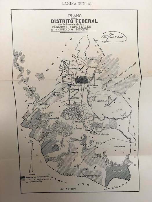 Plano con las propuestas de reservas forestales para la Ciudad de México de Miguel Ángel de Quevedo, 1911