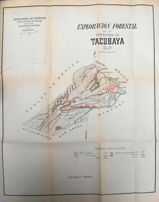 Fuente: Exploración Forestal de la Prefectura de Tacubaya D.F., Escala 1: 50,000, en Revista Forestal Mexicana, México, Año I, Número 5, Noviembre de 1909.