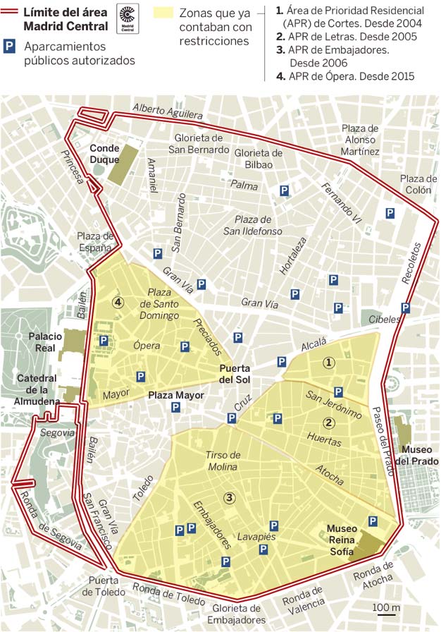 Desde 1991 y hasta 2015, el Partido Popular (PP), un partido de derechas, gobernó la alcaldía de Madrid. Bajo este periodo, exactamente en 2005 y 2006, en los barrios de Las Letras, Cortes y Embajadores, dentro del distrito Centro de Madrid, se implementaron las primeras Áreas de Prioridad Residencial (APR) que, de acuerdo al blog es por madrid, éstas “constituyeron los primeros espacios de la Ciudad de Madrid en los que sólo se permitía el acceso [en automóviles privados] a residentes […] Entre los beneficios aportados con la implantación de estas áreas cabe destacar la disminución de la contaminación, la reducción de ruidos, la mejora de las condiciones de residentes y comerciantes (aumento de las plazas en superficie) y la racionalización de las labores de carga y descarga. Además se incentiva la utilización de medios de transporte como las motocicletas, que tienen permitida la circulación en estas zonas”.
