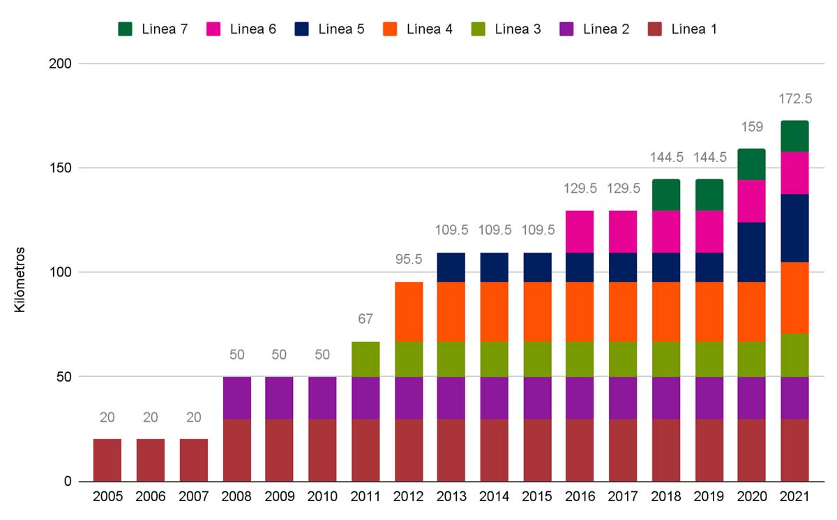 Después de 16 años, el sistema cuenta con siete líneas en servicio con una longitud total de 172 km. Si bien debido a lo que implica planear, construir e implementar cada línea de Metrobús, la red no ha crecido año con año, su crecimiento se ha mantenido al alza, tal como puede observarse en la Ilustración 1.