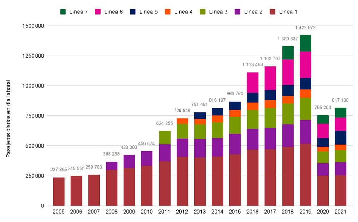 El crecimiento de la red ha venido acompañado de un aumento en el número de pasajeros transportados, creciendo a una tasa de 13 % anual (2005-2019) hasta alcanzar el 4 % del total de viajes realizados en la Ciudad de México.2 Es importante señalar que, ante la pandemia de covid-19, en 2020 su afluencia se redujo en casi 50 %; a pesar de ello, las extensiones de las Líneas 3 y 5 han mantenido una tendencia al alza de viajes del 8 % anual.