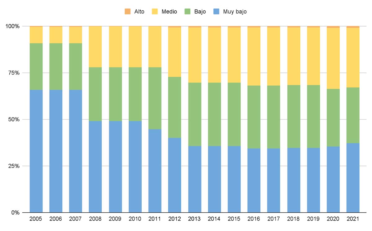 Debe subrayarse que, a medida que se extiende el servicio y como puede apreciarse en la Ilustración 3, la equidad en la cobertura del sistema ha mejorado. En sus inicios, el sistema Metrobús atendía primordialmente a zonas de muy baja marginación localizadas en el centro de la ciudad. Esto ha cambiado a un cierto equilibrio de cobertura entre zonas de muy baja, baja y media marginación. Entre 2005 y 2008, en el 66 % del área total de servicio del sistema —entonces sólo las Líneas 1 y 2— residía población de muy baja marginación. Para 2021, gracias a la creación de líneas que cubren más allá de las zonas centrales —como la ampliación de la Línea 5 hasta Xochimilco—, este porcentaje se ha reducido a 37 %, y la población residente en zonas de marginación media y alta con acceso al sistema ha aumentado del 8.6 % al 32 %.