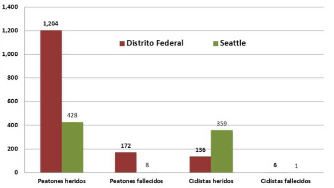 Cabe señalar que la tasa de accidentales de peatones y ciclistas en Seattle es mayor que la del DF, aunque no hay que perder de vista que los datos de México no son absolutamente confiables. Esto debido a que la mayoría de las veces si la víctima no resulta con heridas graves, se puede llegar a un arreglo para evitar ir al Ministerio Público y todo el tedio administrativo-burocrático que es ir ante las autoridades. Incluso, si no fallece en el lugar del accidente, no se contabiliza como tal. En cambio en Seattle aunque el afectado no requiera atención médica especializada, la mayoría de las lesiones y colisiones por pequeñas que sean, quedan registradas.