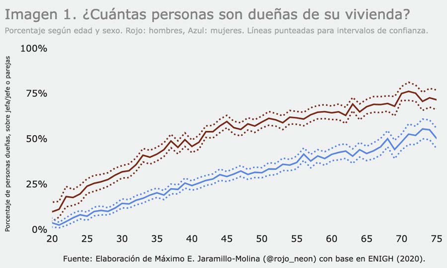 De hecho, según datos de la Encuesta Nacional de Ingreso y Gasto de los Hogares (ENIGH) 2020, 4 de cada 10 personas jóvenes jefas de hogar en México —esta proporción crece a 7 de cada 10 en la Ciudad de México— pagaban alquiler por la vivienda que habitaban. En cambio, menos del 30 % de los hombres jóvenes jefes de hogar y 15 % de las mujeres jóvenes jefas de hogar eran propietarias de su vivienda (aun contando si estuvieran pagándola), como se puede observar en la siguiente gráfica. Entonces, ¿por qué son tan pocas las personas jóvenes que pueden acceder a una vivienda adecuada?