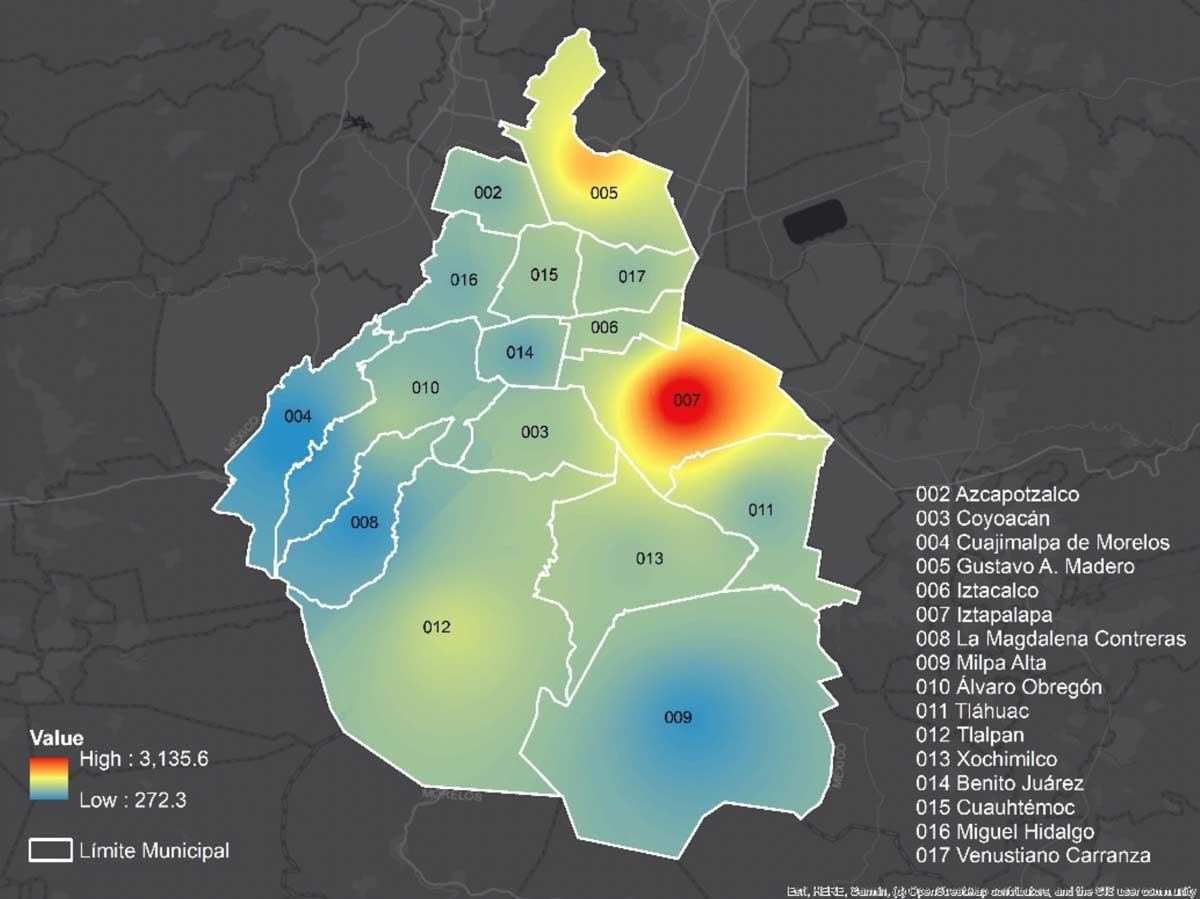 Veamos el caso particular de la Ciudad de México, la cual se ha convertido en el foco de la pandemia con 15 546 casos confirmados acumulados hasta el 17 de mayo, previo al regreso de algunos municipios del país a la “Nueva Normalidad”. Las alcaldías que, hasta ese momento presentaron el mayor número de contagios son Iztapalapa (3 138 casos), Gustavo A. Madero (1 931) y Tlalpan (1 219). Por otro lado, las más altas tasas de contagio se presentaron en las alcaldías Milpa Alta (337 por cada 100 000 habitantes), Iztacalco (241) y Xochimilco (220). En ambos casos, no es sorpresa que sean estas alcaldías las que tengan una mayor concentración de casos, ya que cuentan con los factores mencionados que las hacen más vulnerables a la propagación del virus.