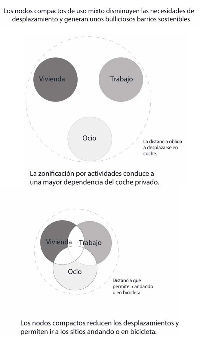 Ilustración. 1. Esquema conceptual que muestra dos de los tres principios de sustentabilidad urbana: compacidad y mayor mezcla del uso del suelo