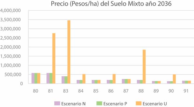 Nota: Esta gráfica muestra los precios de suelo a futuro, basados en una política pública territorial específica (en este caso, el escenario U representa más mezcla de uso del suelo y mayor densidad) y asignados a diferentes unidades geográficas del conjunto de estudio.