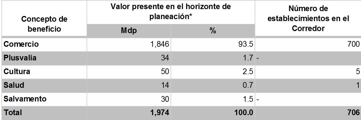 La evaluación socio-económica (CEE-ITESM, 2015a) determina la rentabilidad social del Corredor en un valor presente neto (VPN) de 646 millones de pesos (mdp) descontados al 10% anual en un plazo de 30 años. Como en cualquier análisis costo-beneficio, la elección de los costos y los beneficios resulta crucial para determinar el alcance de sus conclusiones. La Tabla 1 muestra que, por un lado, los costos contemplados son únicamente aquellos in situ, limitados al polígono intervenido, lo que obvia la ocurrencia y evaluación de costos externos; por otro lado, la misma Tabla muestra que los beneficios contemplados son predominantemente privados, aunque allí se presenten como “sociales”. Ambos elementos cuestionan de modo fundamental el carácter “social” de sus conclusiones.