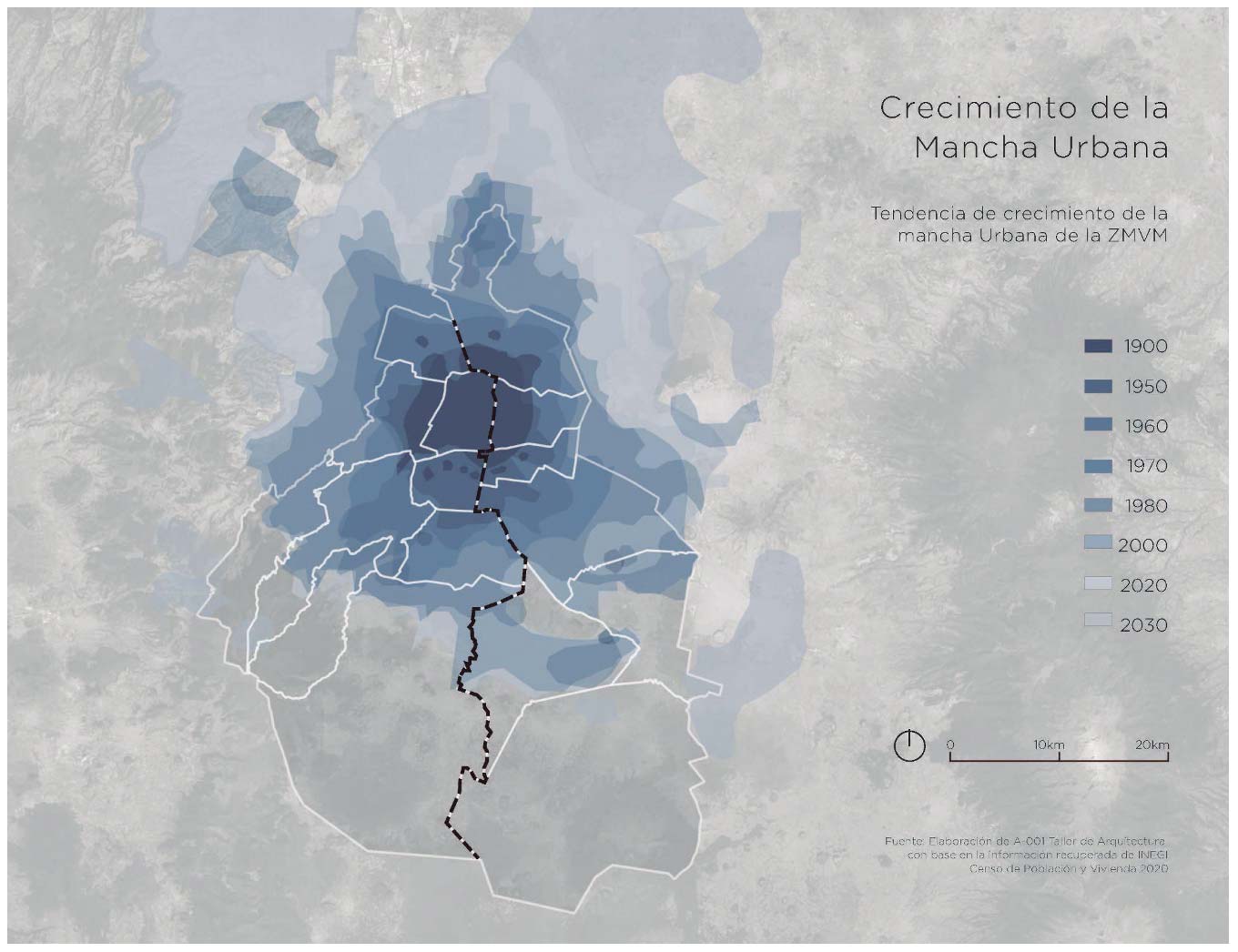 Hoy en día, la Zona Metropolitana del Valle de México abarca una superficie de casi 8000 kilómetros cuadrados, 60 municipios en tres estados distintos, con una población de alrededor de 21 millones de habitantes. Desde 1800, la mancha urbana se ha expandido más de 500 veces su tamaño, con una mayor velocidad entre 1970 y 1980. El crecimiento acelerado de los territorios urbanos no es exclusivo de Ciudad de México, toda gran metrópolis está sujeta a recibir miles de personas diariamente que llegan con la esperanza de un mejor futuro. Ha sido también el caso de Jalisco, el Estado de México, Michoacán y Guanajuato. El sueño urbano se materializa sólo para unos cuantos, mientras que el resto son empujados a las periferias, obligados a vivir en condiciones precarias con altos índices de marginación. Es claro que la gestión de las administraciones no ha sido la más adecuada, pues no ha logrado dar solución a un problema que lleva ya largo tiempo.